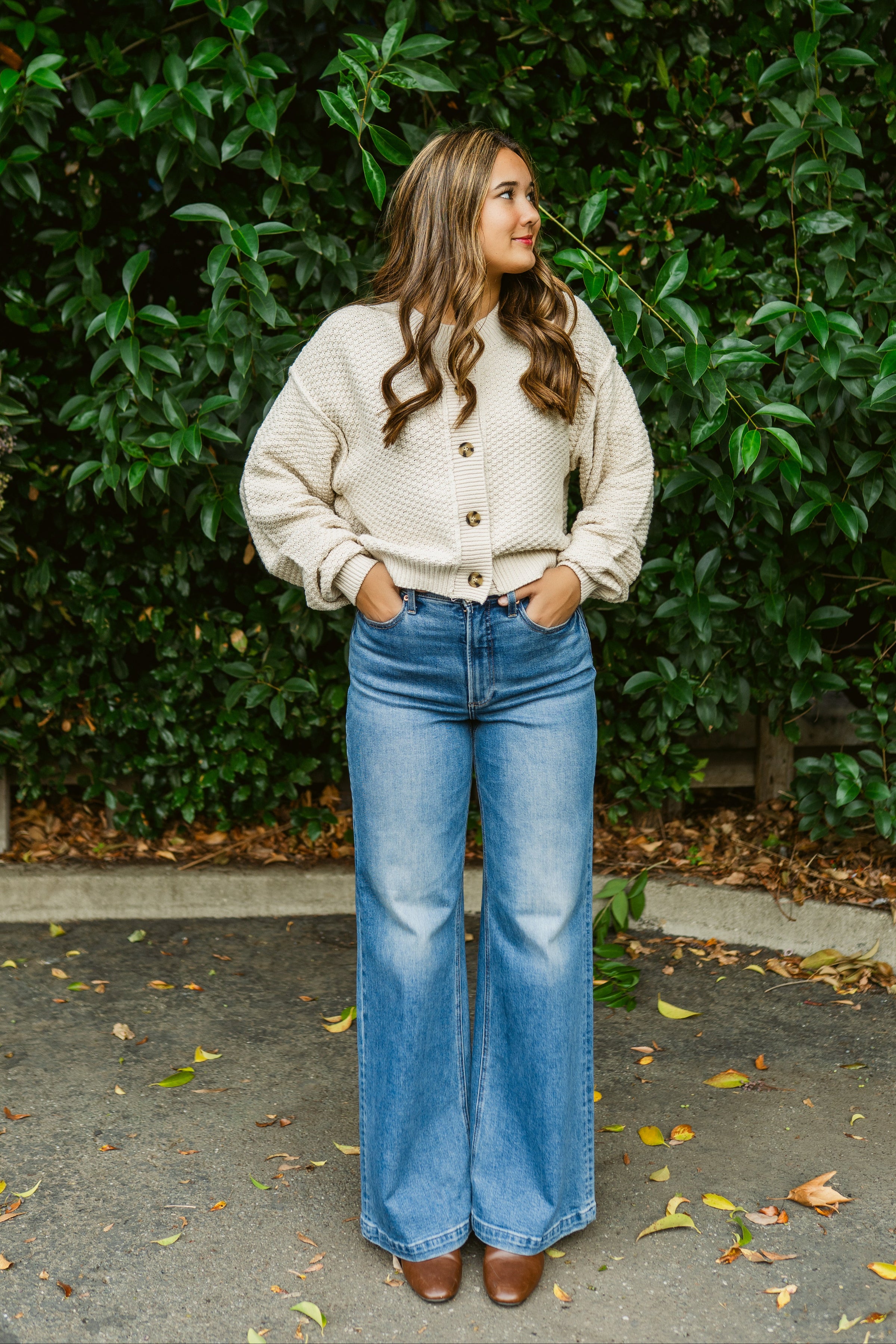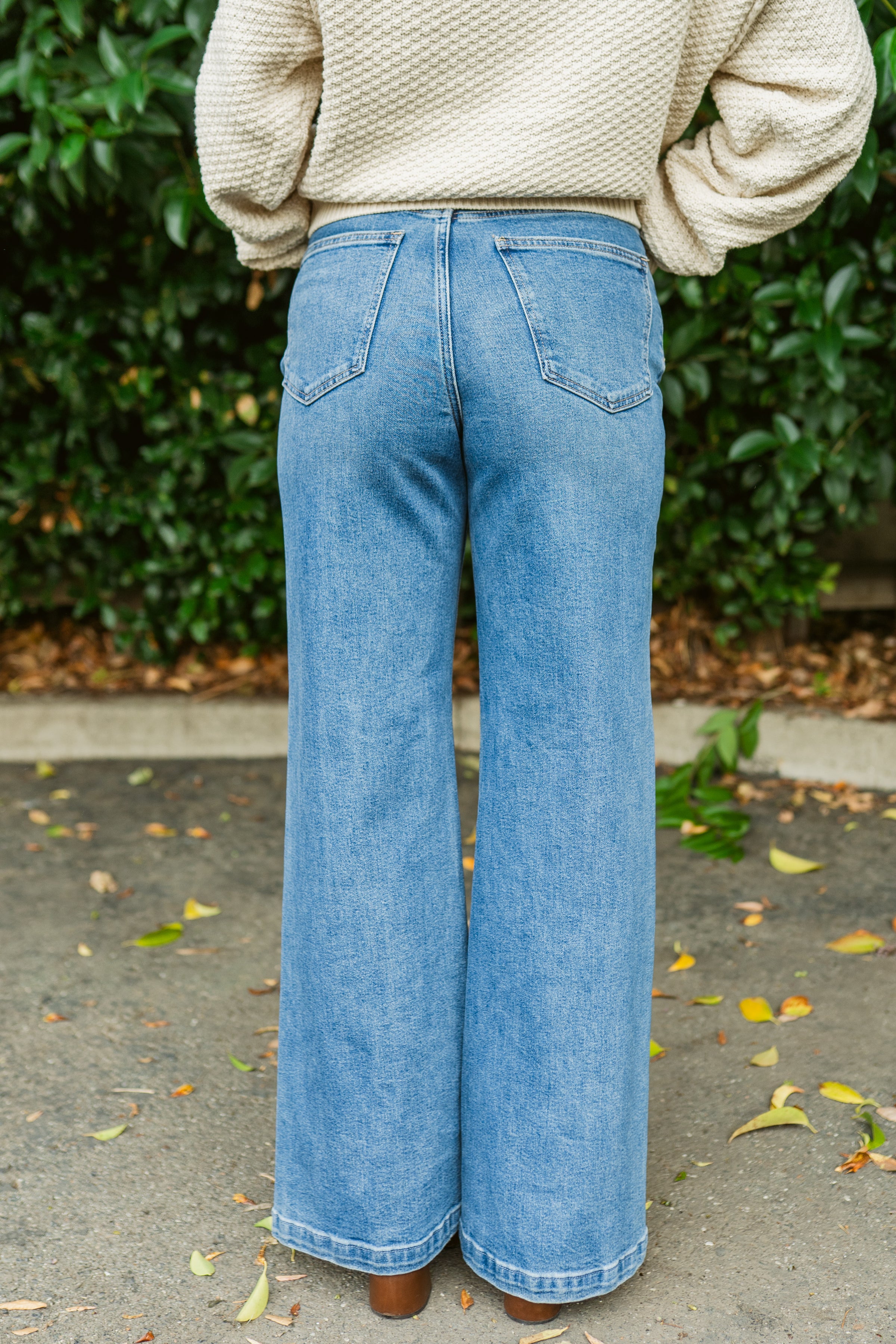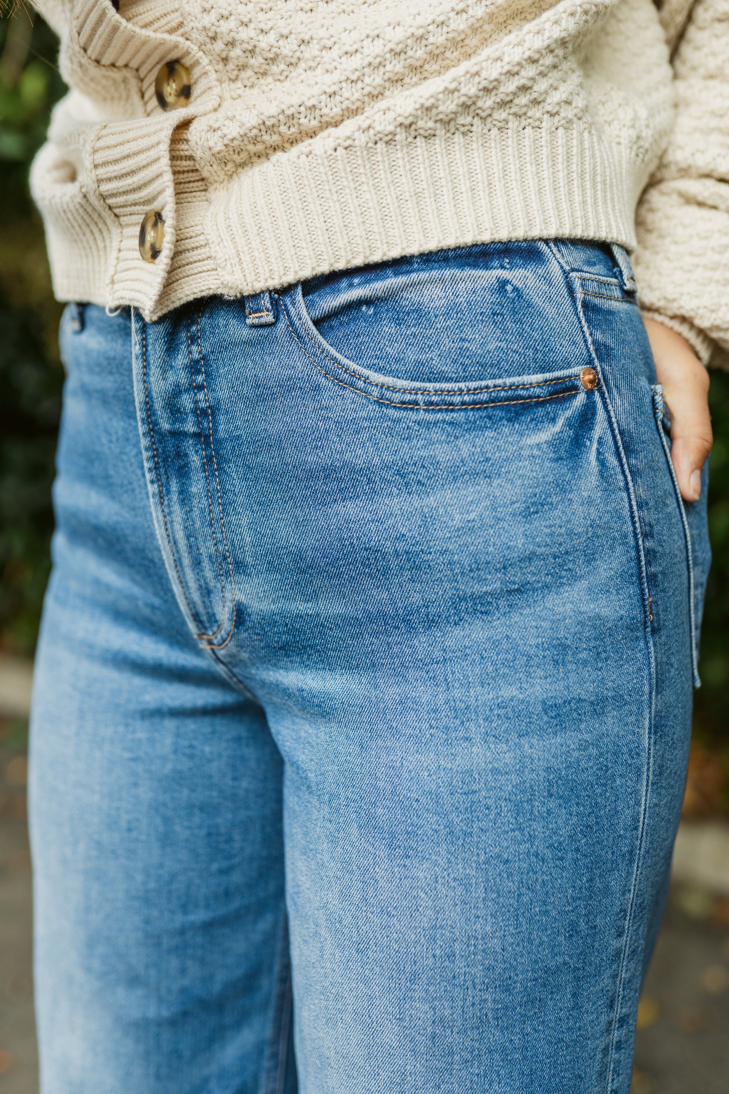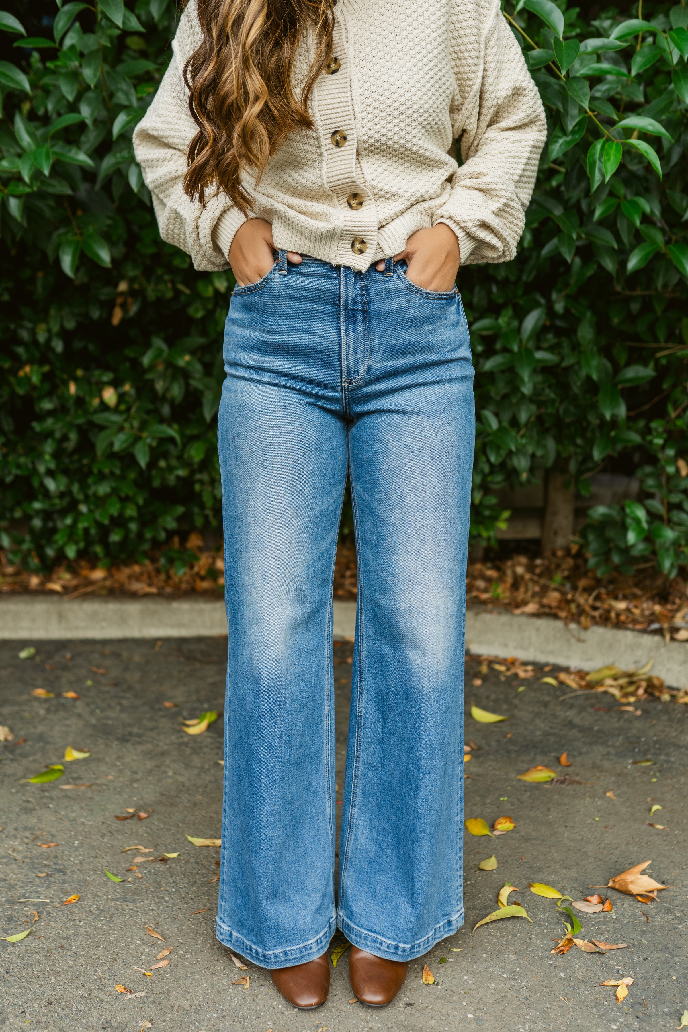 Introducing the Lana High Rise Ultra Wide Leg jeans - a stylish twist on a classic boot cut silhouette, crafted from our signature comfort-stretch denim. These jeans feature a high rise waist for a flattering fit, with a cropped ankle hem and unique raw cut detail. Available in a light blue wash with just the right amount of fading and distressing for an effortlessly cool look. (Jeans included - not our cute model Brit!)