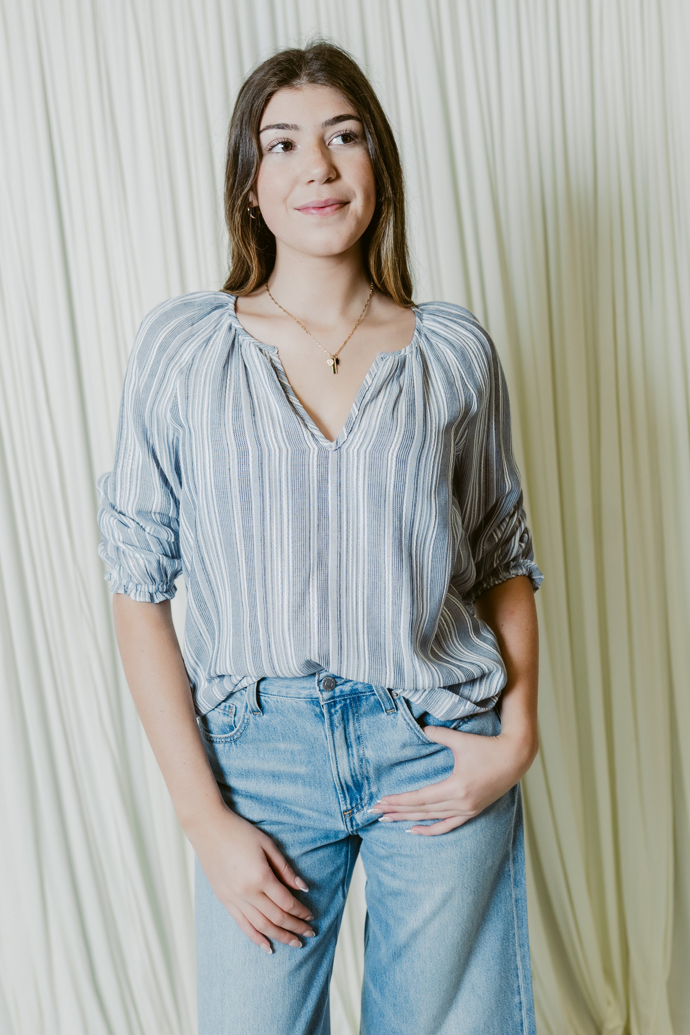 Elevate your coastal wardrobe with this refined 3/4 sleeve top, designed to capture the essence of seaside elegance. The subtle shimmer detailing adds a touch of luminous sophistication, making it perfect for transitional seasons and versatile styling. Whether layered over basics or worn as a standalone piece, this top brings understated glamour to your everyday collection. The three-quarter length sleeves offer a flattering silhouette while maintaining a polished, contemporary aesthetic ideal for both casual outings and elevated occasions.